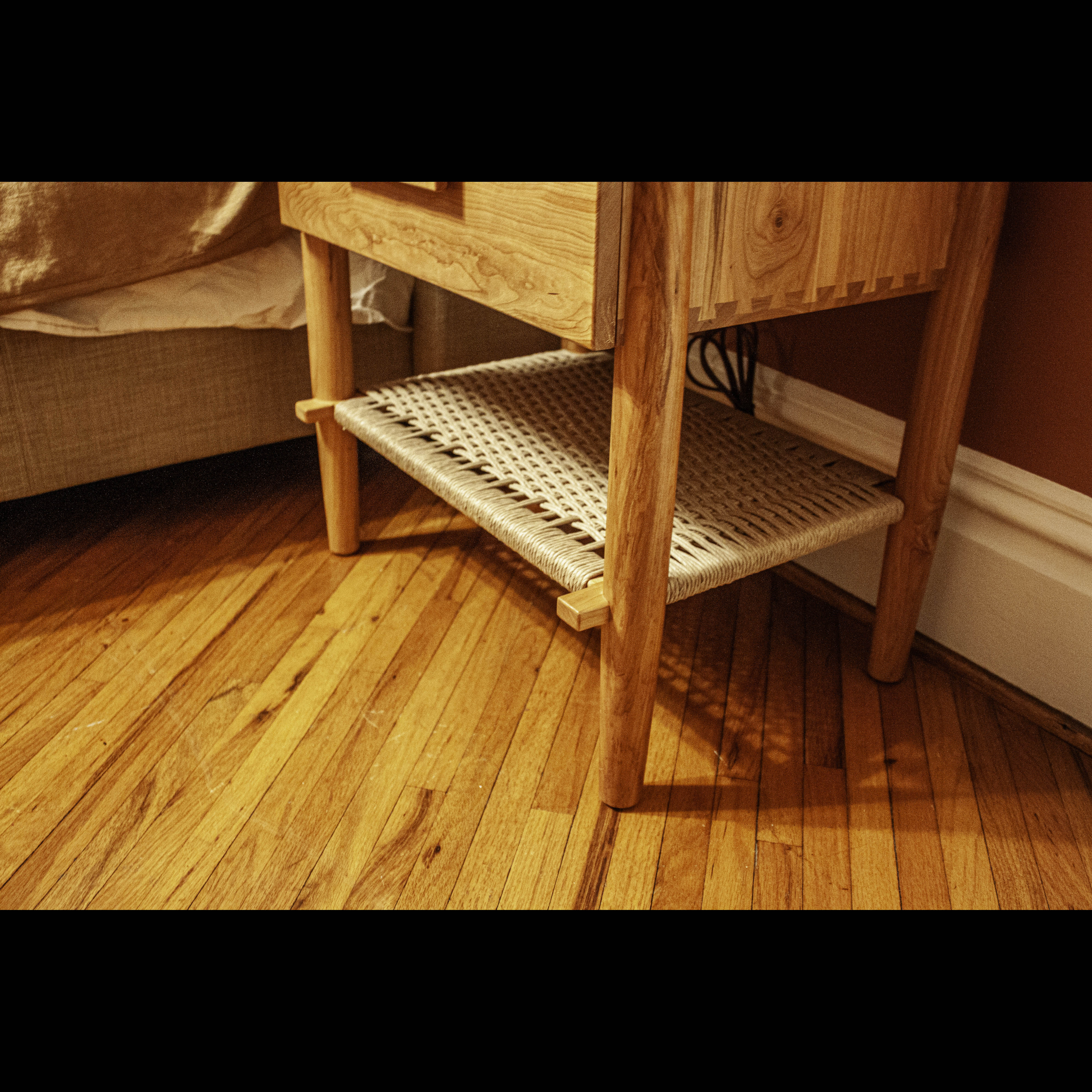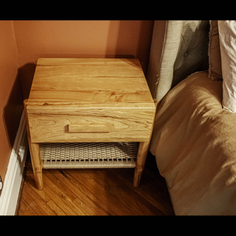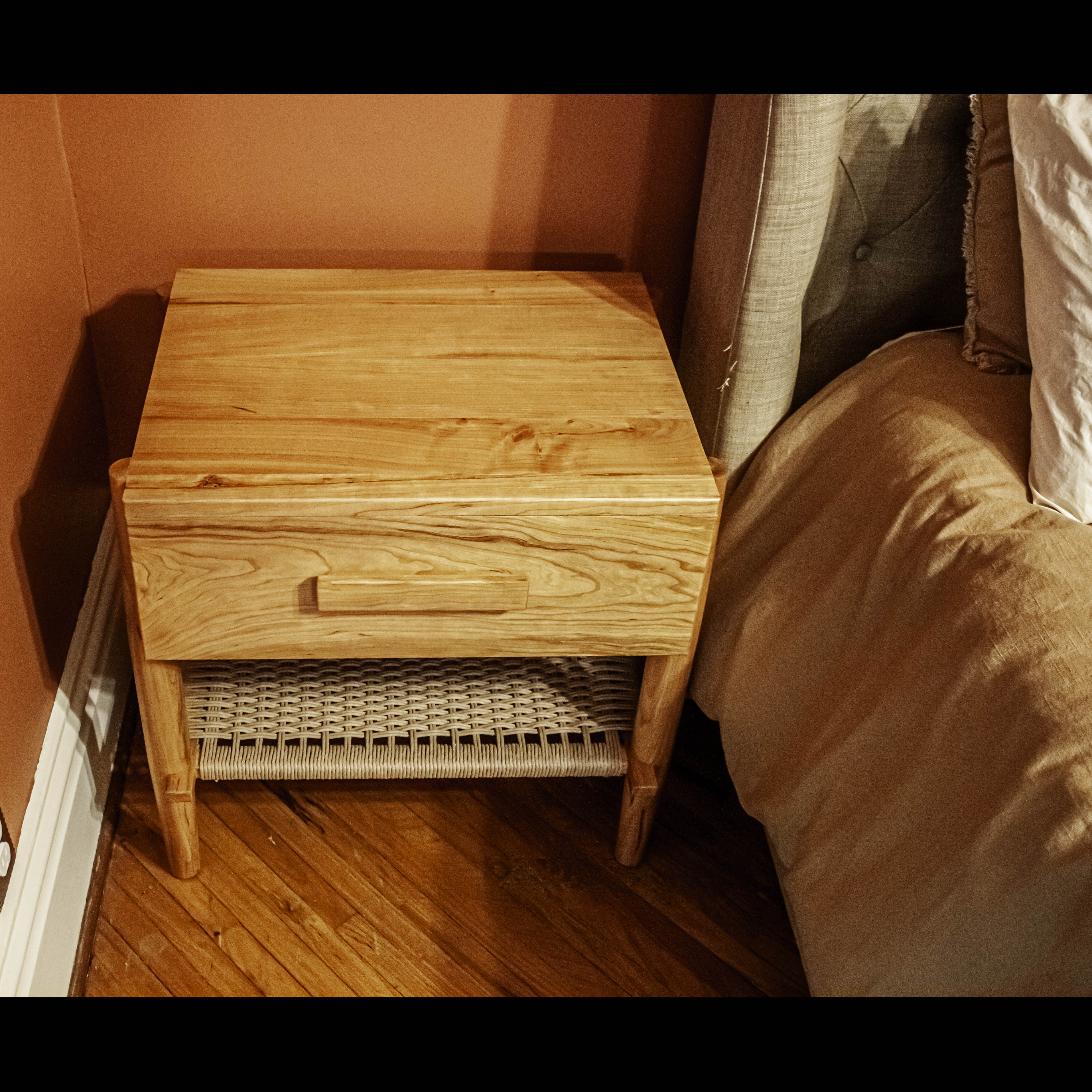 These stunning cherry, modern design nightstands feature hand turned legs, dovetail joinery, hand woven danish cord shelves and built in electrical outlets.