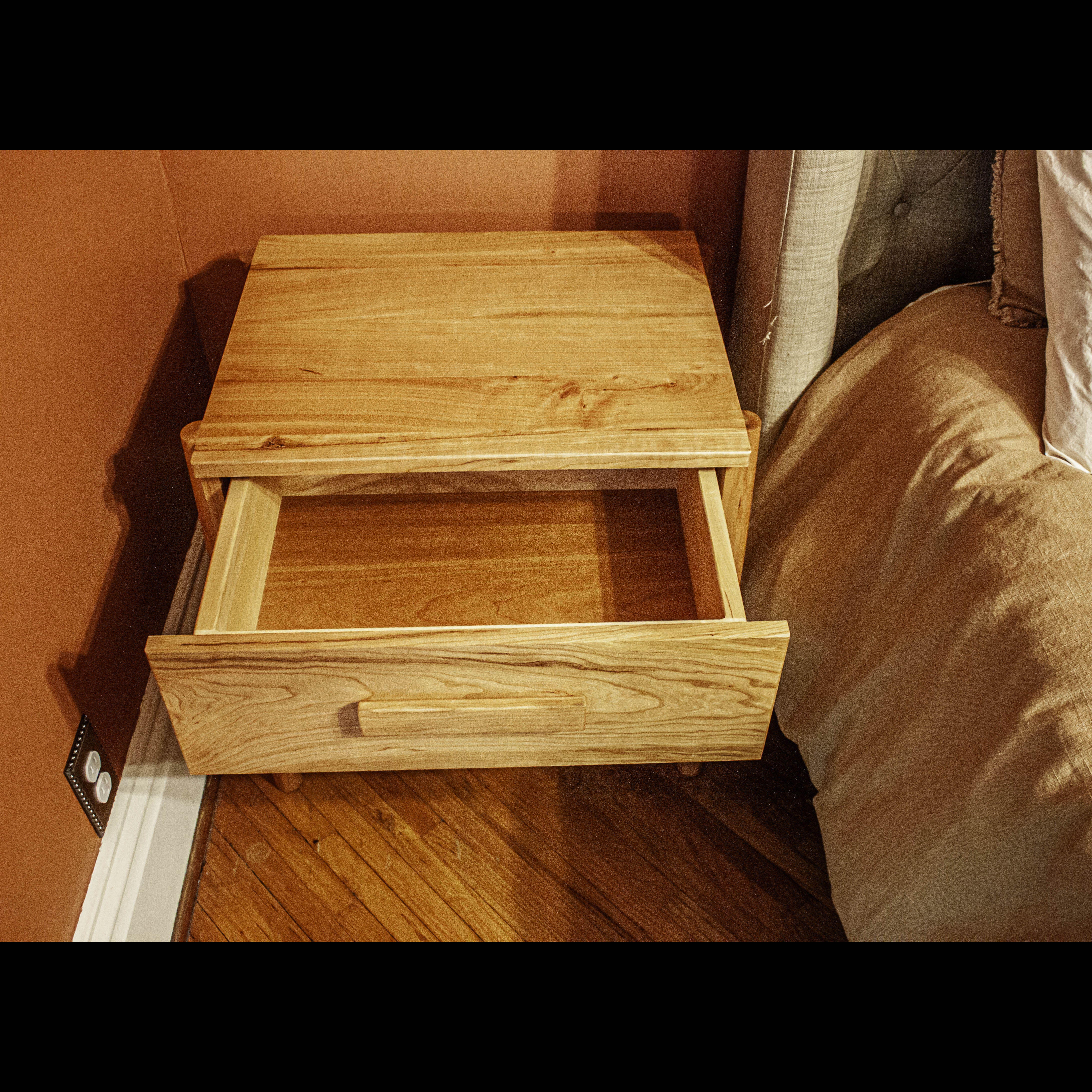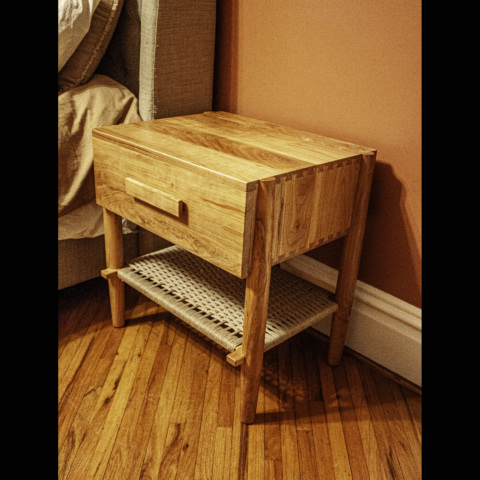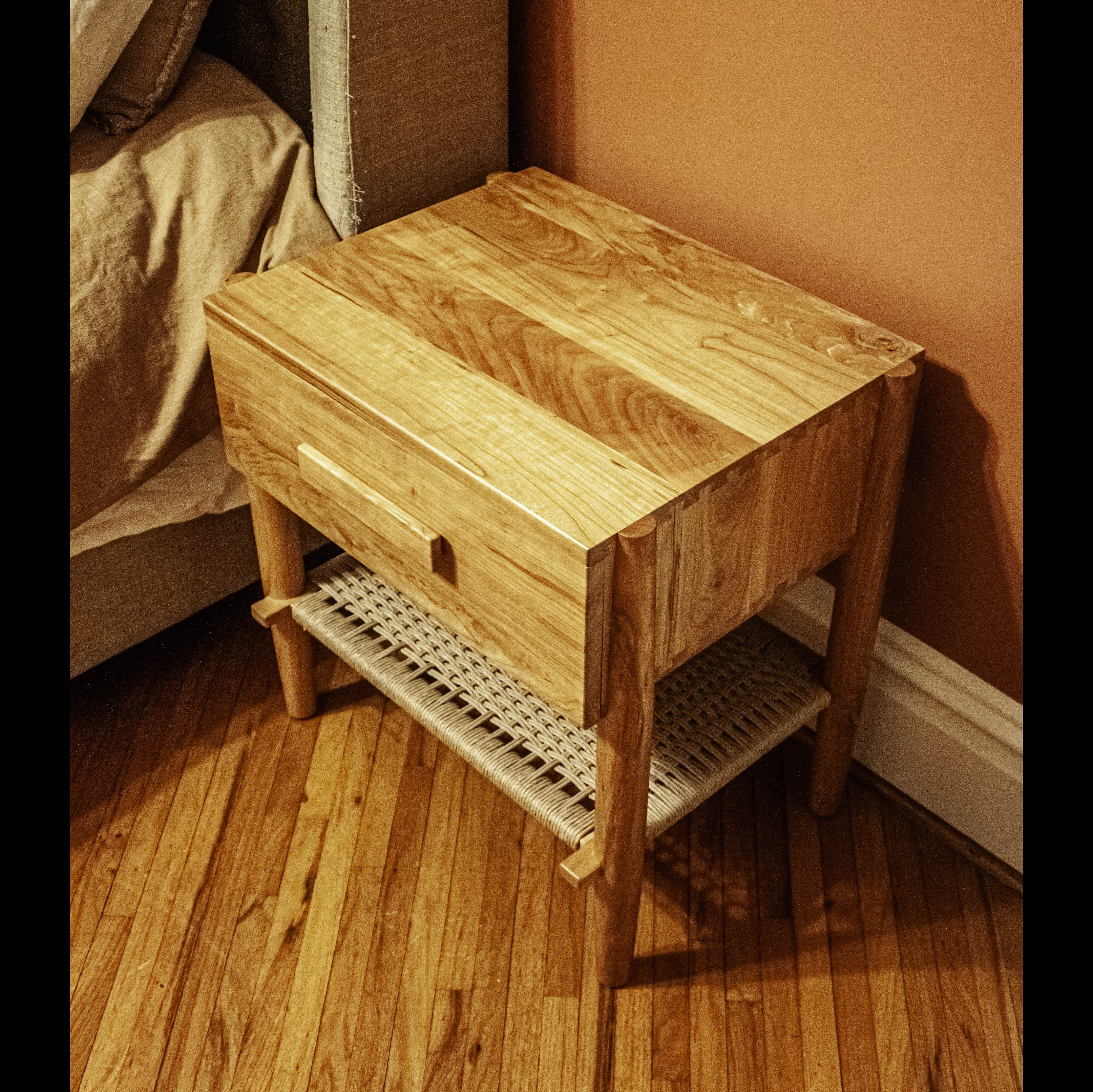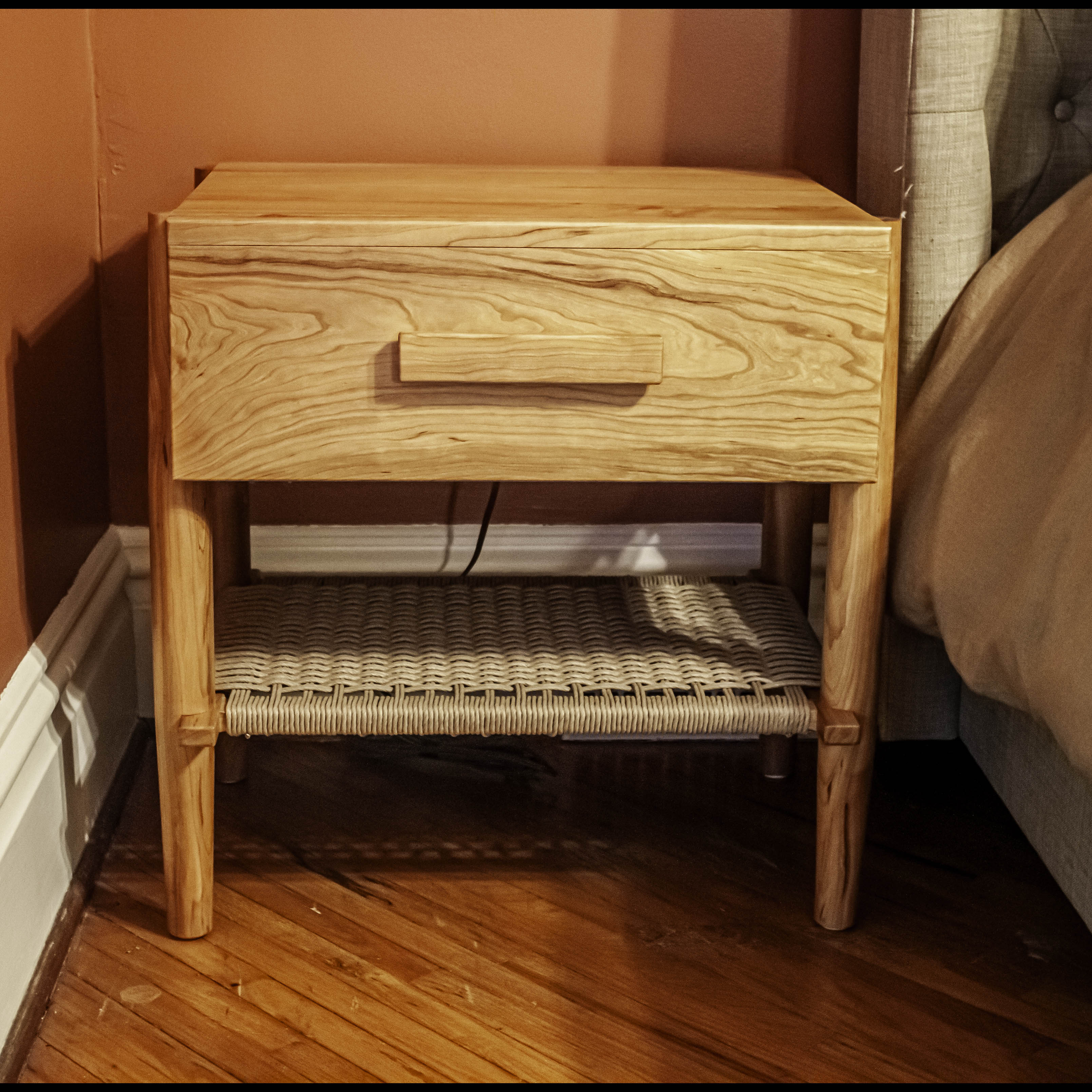 These stunning cherry, modern design nightstands feature hand turned legs, dovetail joinery, hand woven danish cord shelves and built in electrical outlets.