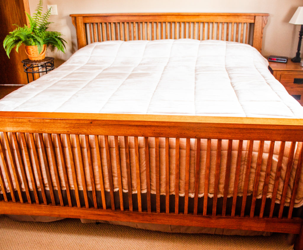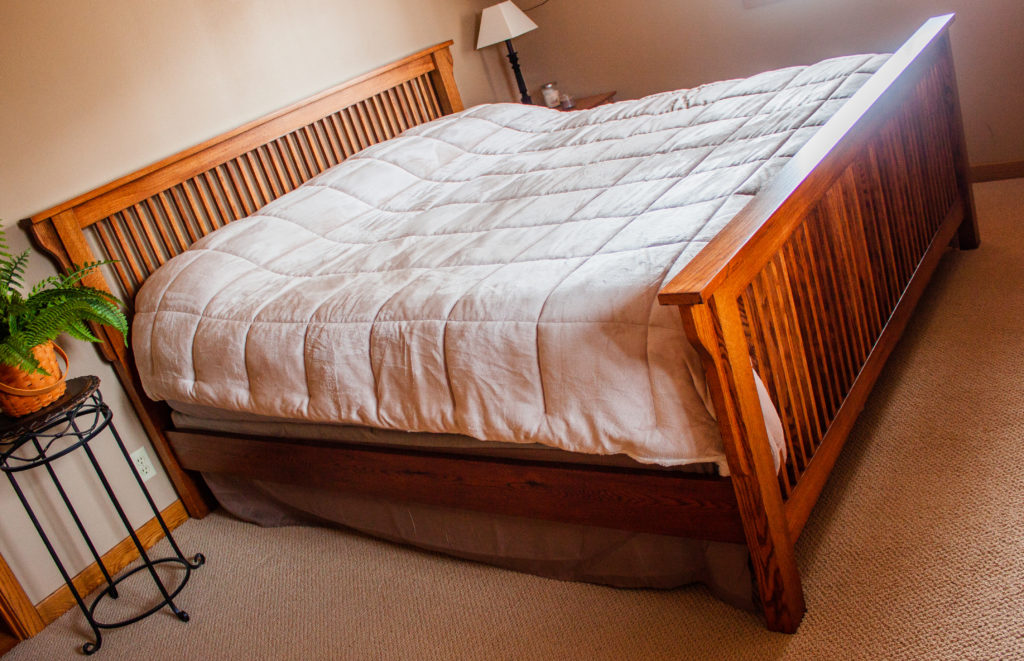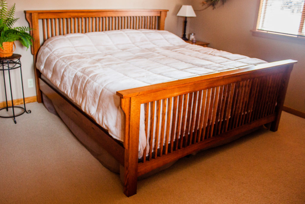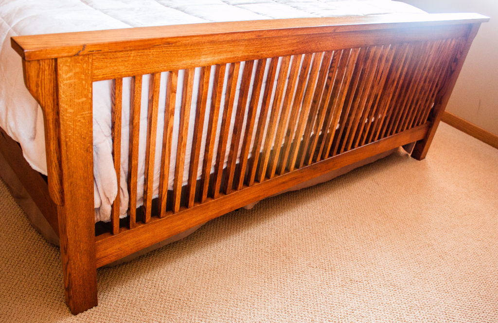 This bespoke maple stained, white oak, mission style, bed frame was created to match the interior design features of this particular bedroom. It accentuates, complements, and completes the mission style set of furniture that the owner previously possessed.This bed has become a keystone to a set that will likely be passed down for generations to come, and we are only too happy to have played a role in making that possible.