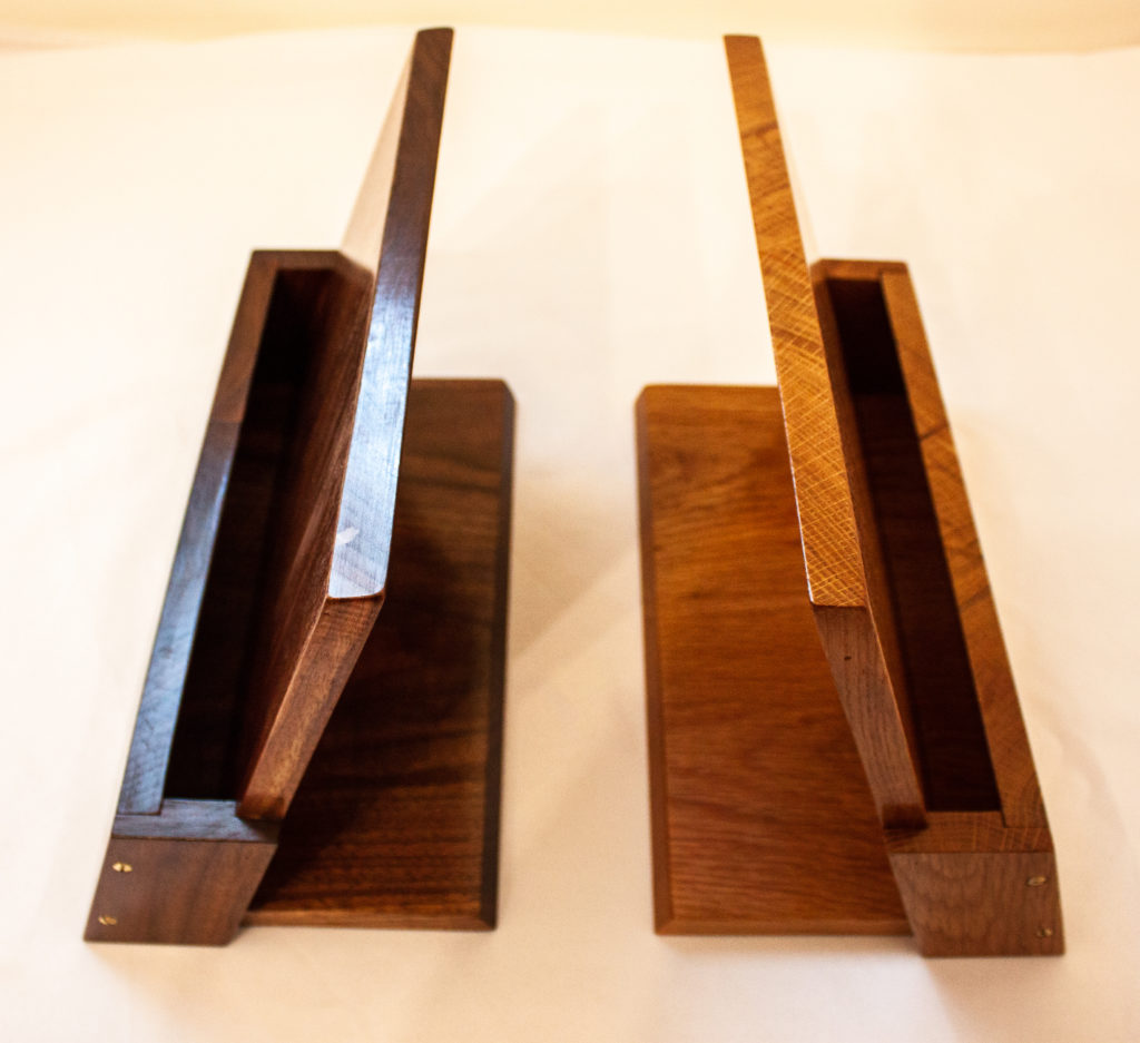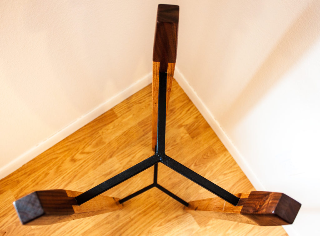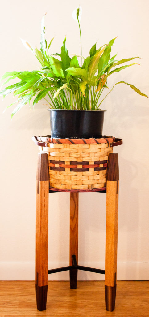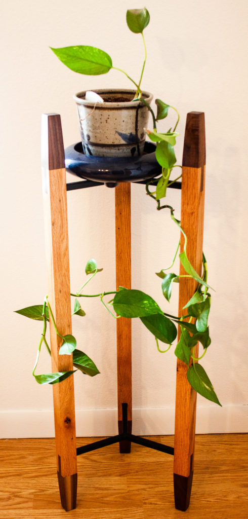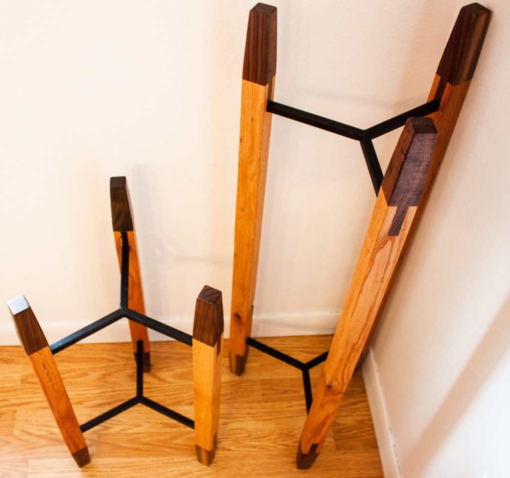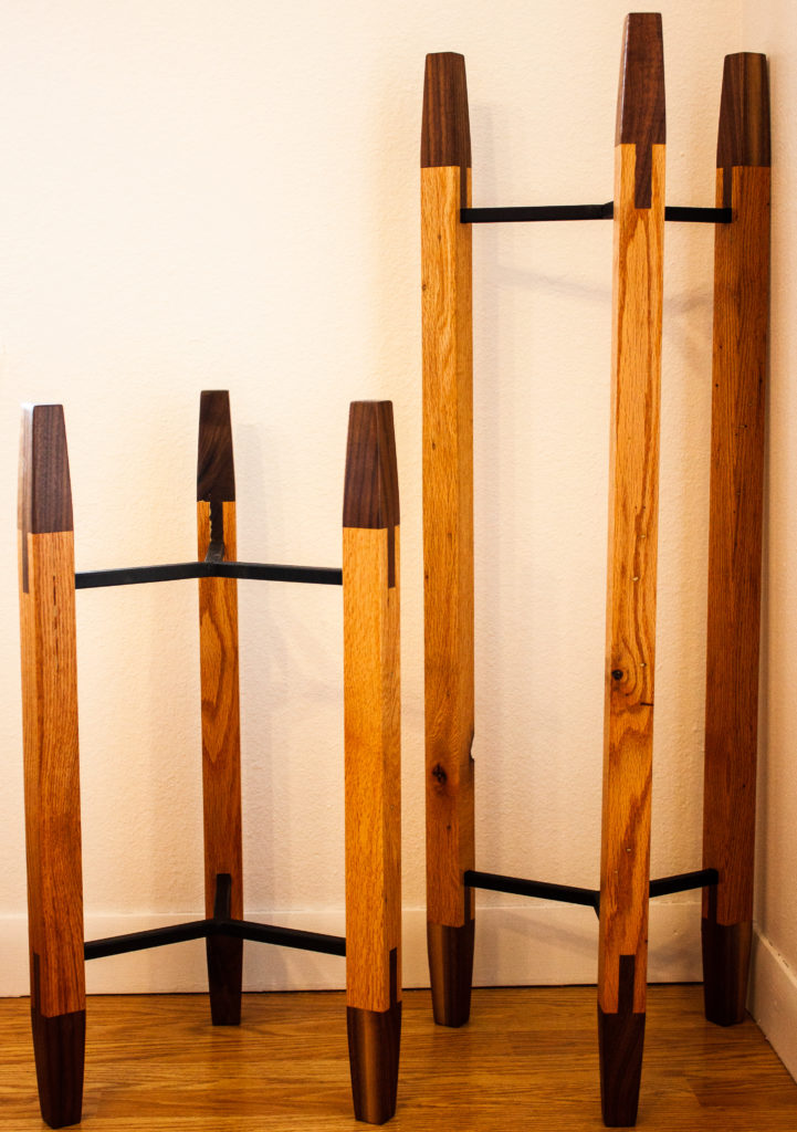These plant stands are a newer, sturdier version of our previous design. They stand 2 and 3 feet tall and are comprised of white oak and walnut legs with welded steel bases. They would likely sell for around $75 – $100 a piece depending on size, wood type, and stain.