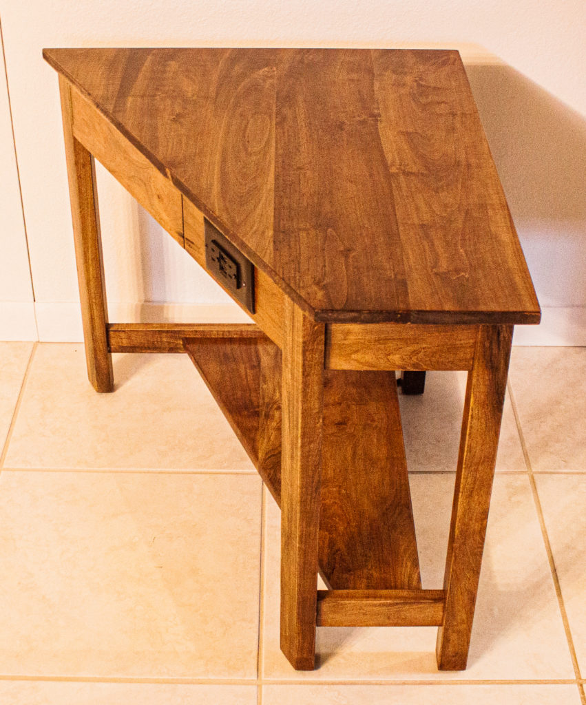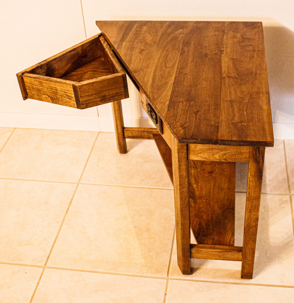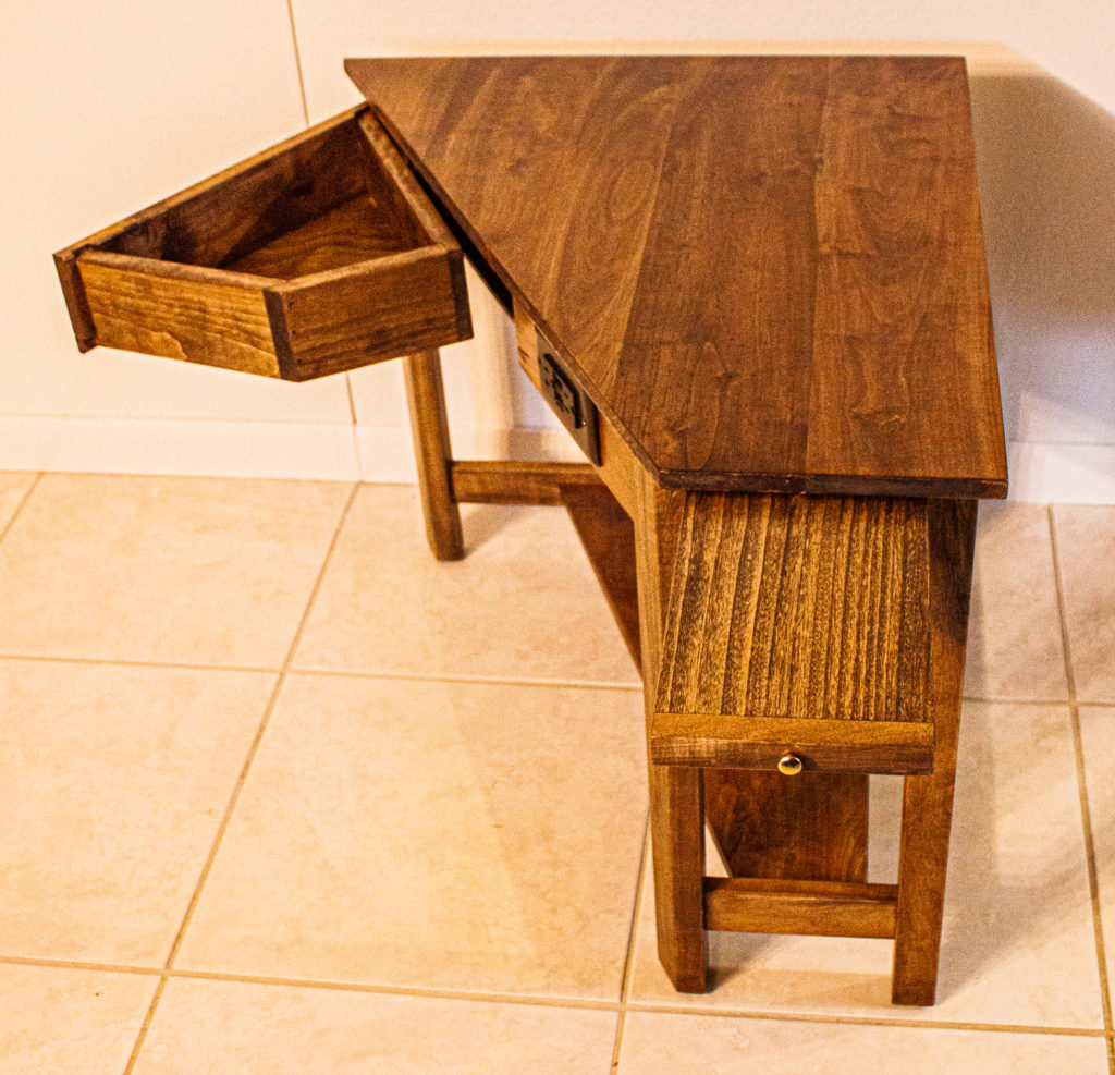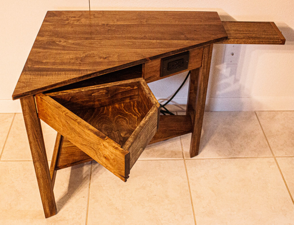 This bespoke side table is made of walnut stained poplar. It was designed to fit in a very specific location. It has a lower shelf, a side drawer swings open, a board pulls out the front as a cup holder, and we incorporated an outlet with USB ports. Not only does this customer get a one of a kind piece, they get exactly what they want, at the best bang for their buck, which incorporates the highest functionality possible. It’s a win, win, win. If you have an idea for something you would like made and want details on pricing and design options, DM us here, on Facebook, on Instagram, send us an email at krafkakraft@gmail.com, or fill out a form from our website at https://www.krafkakraft.com/contact/ We look forward to making your idea into a reality.