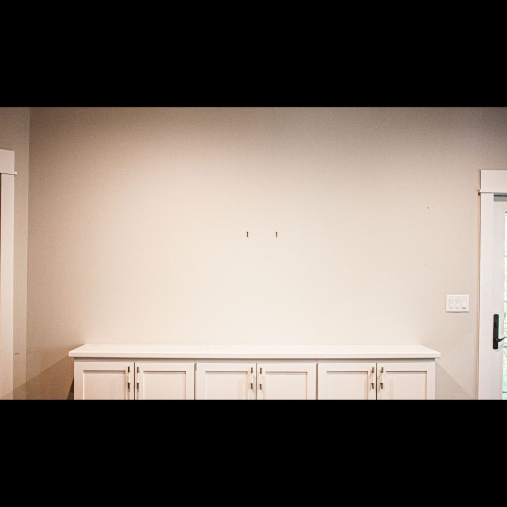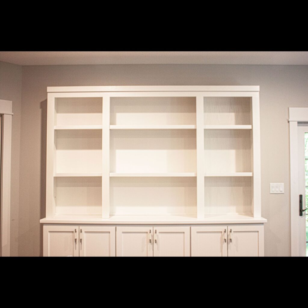 This shelving unit was designed to match trim and a built-in bookshelf in the same room. It was made of white oak, oak plywood and painted to match the color scheme of the room. This shelving unit was securely affixed to a pre-existing credenza and mounted securely to the wall to prevent the unit from tipping. It features adjustable shelves to accommodate different sized books, pictures, and decor. This bespoke shelving unit was the perfect addition to this area. It tied the room together and added plenty of space for books and ornamentation.