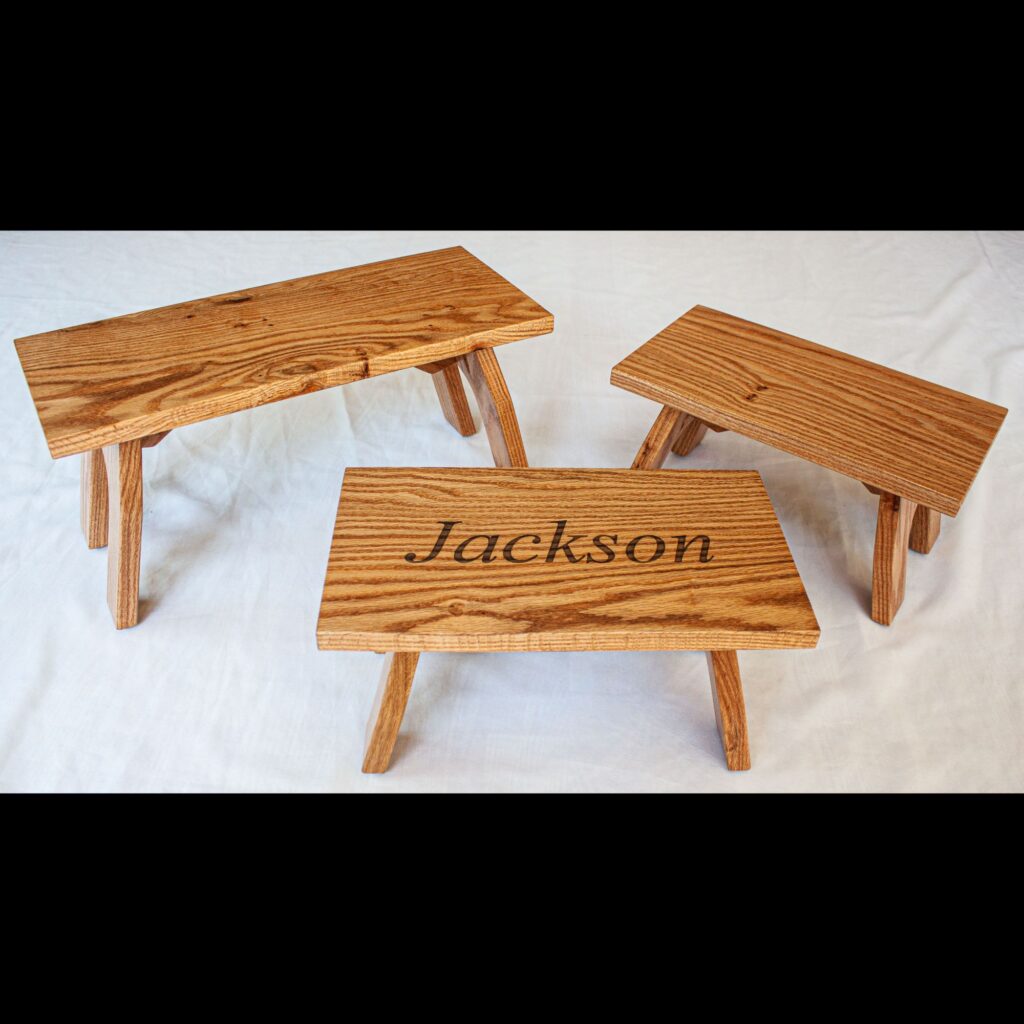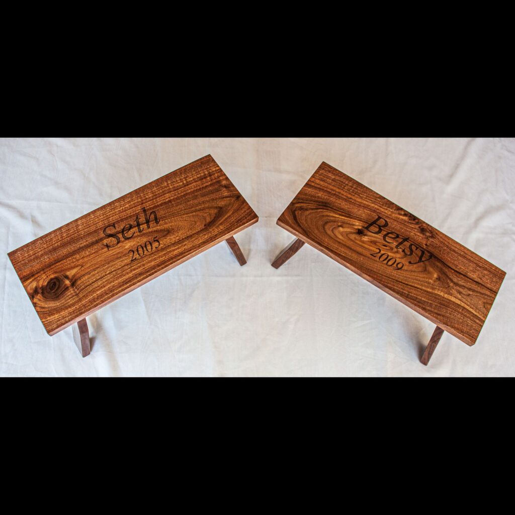 These stools were made of white oak and walnut, hand finished with satin polyurethane and personalized with the intended recipient’s name engraved on top. These stools have a family history that will be treasured for generations to come.