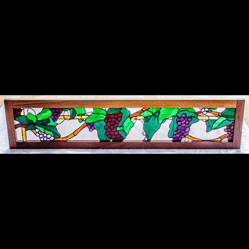 We built this custom walnut frame for a pre-existing piece of stained glass. It is made to be hung up in front of a window. The frame is simple enough that it doesn’t detract from the glass yet it contrasts enough with it to really make it pop, just as a good frame should.