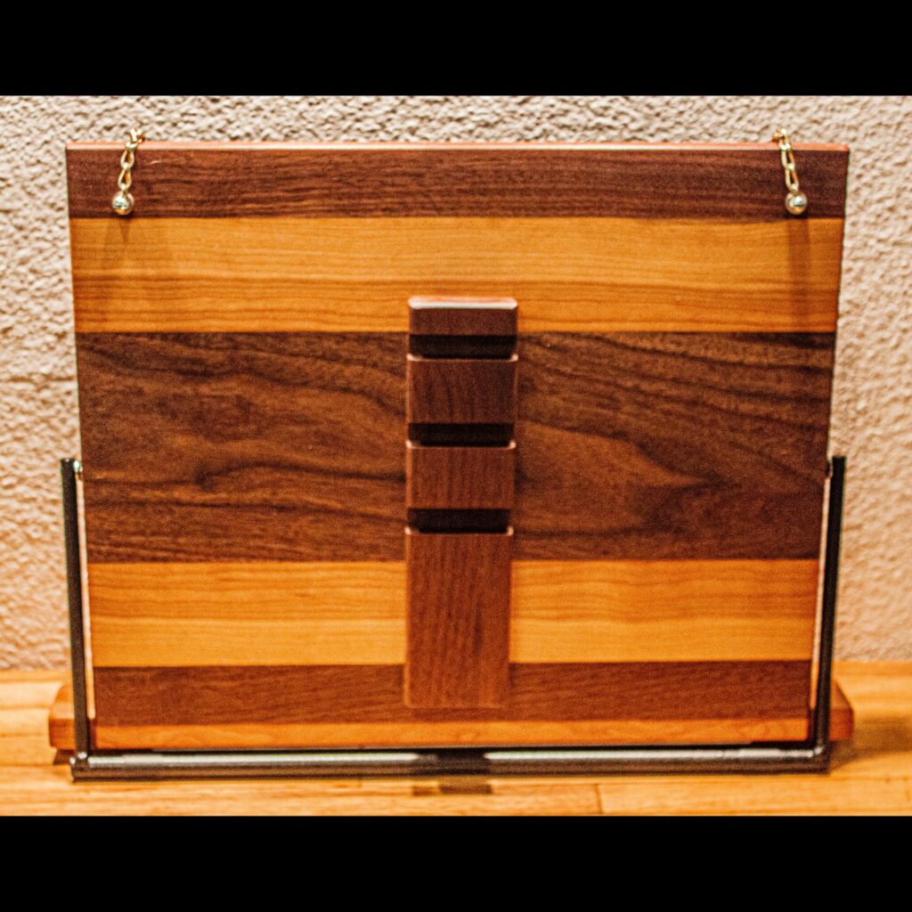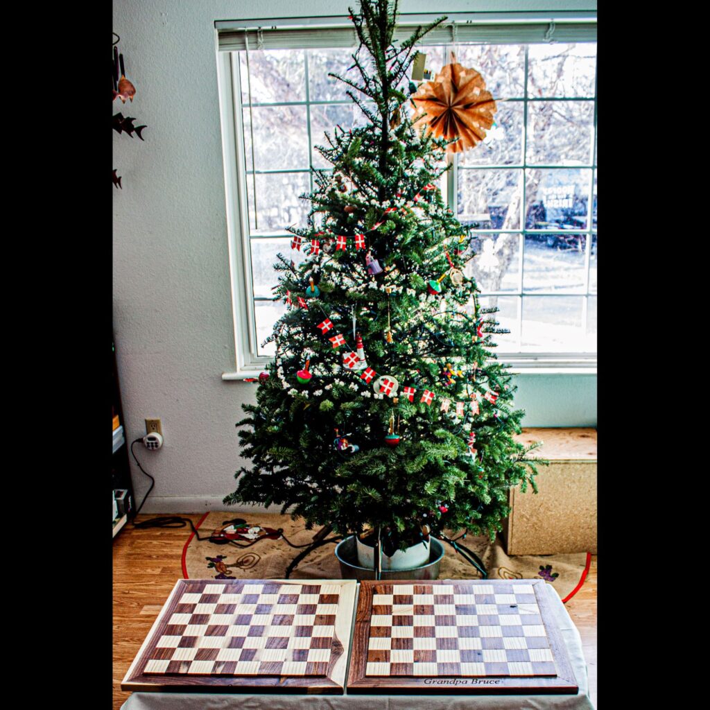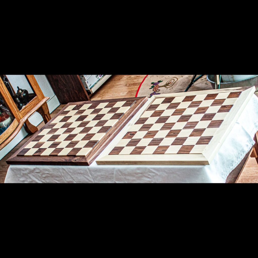 A customer came to us requesting that we make him four chess boards as Christmas gifts for his grandchildren and that we engrave Grandpa Bruce on his side of one of the boards. Making chess boards was a new endeavor for us, but a welcomed challenge. We were well pleased with the outcome, especially for our first attempt. These chess boards are made of a walnut and ash veneer over a plywood substrate, framed with walnut, and finished with satin polyurethane.
